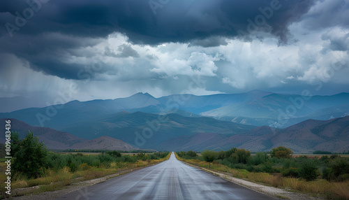 Naklejka premium straight asphalt road going into mountains on he horizon, heavy dark clouds...