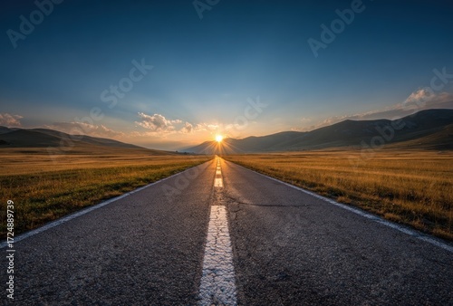 © Yudhi, Fototapeta premium Straight asphalt road leads to horizon at golden sunset in a grassland valley. Blue sky above