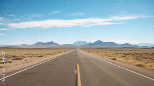 Fototapeta premium Straight desert road flanked by mountains, clear blue sky, smooth asphalt, and dry grass, with a sense of freedom and journey.