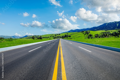 Naklejka premium Straight highway road and green grassland nature landscape under blue sky