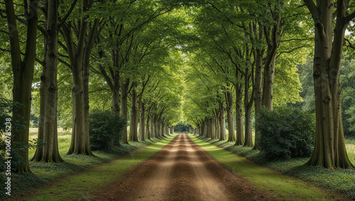 © janzwolinski, Obraz premium Straight path with towering trees in a serene forest setting