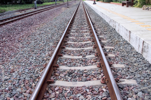 © Amphawan, Fototapeta premium Straight railroad line with small stone on floor background