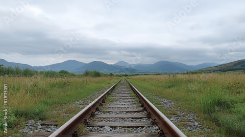 © Daria94, Fototapeta premium Straight railroad tracks cutting through green fields under a cloudy sky, leading towards distant mountains, creating a serene rural landscape.