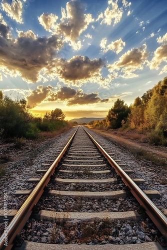 © atar, Fototapeta premium Straight Railroad Tracks Leading to Sunset Sky with Dramatic Clouds