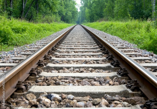 © Surin, Fototapeta premium Straight Railroad Tracks Through Lush Green Forest Landscape on Summer Day