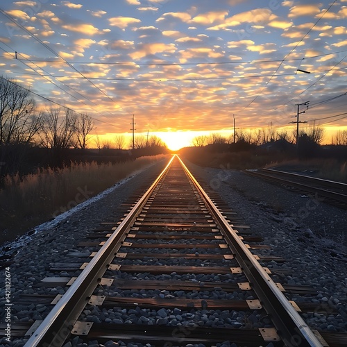 © Strother, Fototapeta premium Straight railway tracks leading towards a dramatic sunset with textured clouds. Perspective view symbolizing journey, travel, future, or direction.