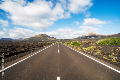 © eunikas, Fototapeta premium straight road among vineyards and volcanoes in Lanzarote, Canaray Islands, Spain