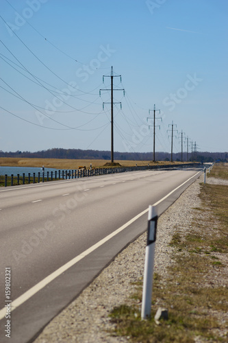 Fototapeta premium Straight road and high-voltage power transmission line against blue sky