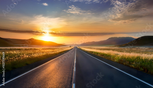 Fototapeta premium Straight road at sunrise through open fields