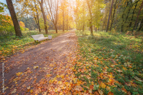© serjiob74, Fototapeta premium Straight road in the city park at autumn evening.