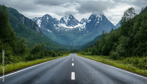 © NIKMATUL, Fototapeta premium Straight road into valley with snow capped mountains under cloudy skies
