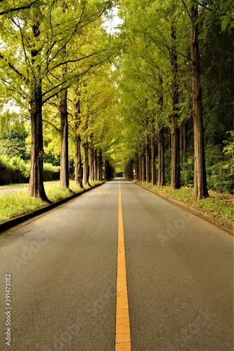 © SK, Fototapeta premium Straight Road Lined with Metasequoia Trees in Autumn