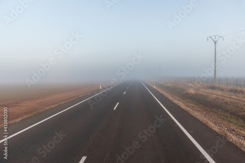 © M. Perfectti, Fototapeta premium Straight road on a plain with fog in the background and poles with electrical wiring on the edge.