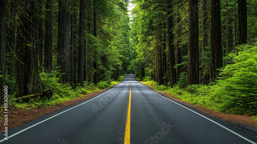 Naklejka premium straight road stretching through lush green forest, surrounded by tall trees and vibrant foliage, invites sense of adventure and tranquility