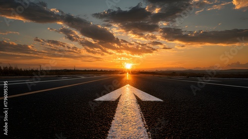 Naklejka premium Straight road with forward direction arrow leads toward a brilliant sunset sky