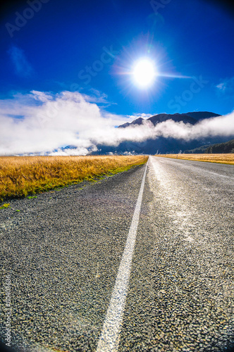 © tana2222, Fototapeta premium Straight way to the mountain Asphalt road over cloudscape
