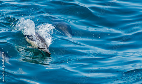© JustTheLetterK, Obraz premium Strąk z delfinami pływającymi i skaczącymi razem. Niebieska woda. Delfiny.