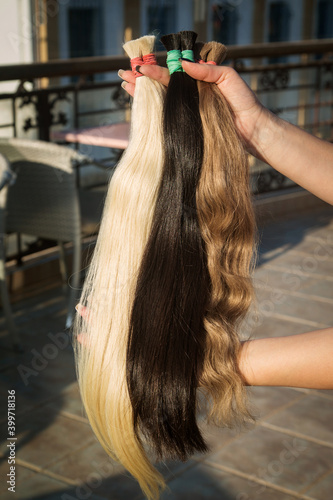 Naklejka premium strands of natural women's hair for encapsulation and extension in a beauty salon.