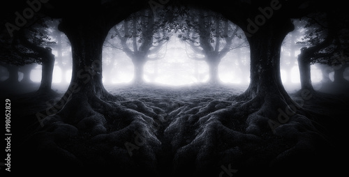 © mimadeo, Fototapeta premium Straszny ciemny las z korzeniami drzew