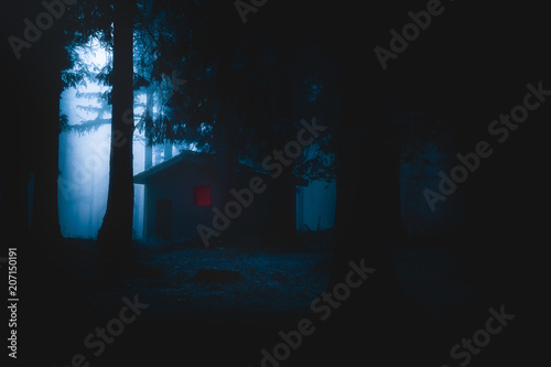 © mimadeo, Fototapeta premium straszny dom oświetlony w tajemniczym lesie horroru nocą