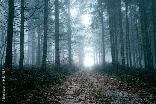 © robsonphoto, Naklejka premium Straszny niebieski ciemny las foogy krajobraz.