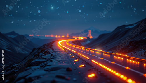 Naklejka premium Strategic Planning for Milestone Journey Futuristic Roadmap at Night Scenic Location Enchanted Landscape