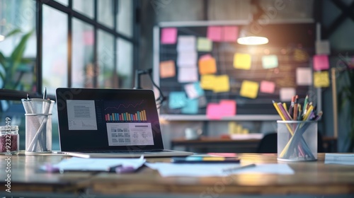 © laliz, Obraz premium Strategic PR Command Center Laptop Media Monitoring and Press Release Drafts in Modern Office Setting