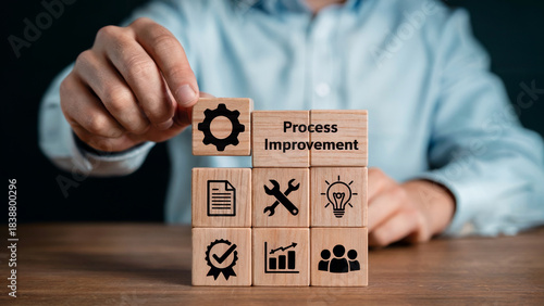 © Shahzad, Obraz premium Strategist strategically places wooden block symbolizing gear to achieve successful process improvement and business goals