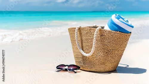 Fototapeta premium Straw beach bag with towel and sunglasses on tropical sand summer vacation concept