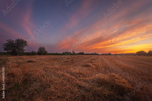 © darekb22, Fototapeta premium Straw on a rural stubble field and colorful clouds after sunset, summer in eastern Poland
