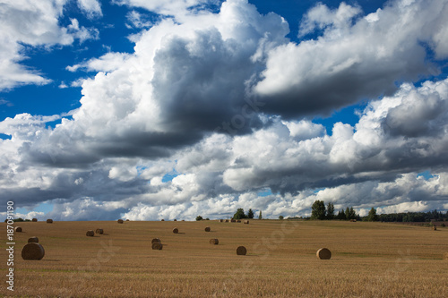 © Janis Smits, Obraz premium Straw rolls in counrtyside landscape.