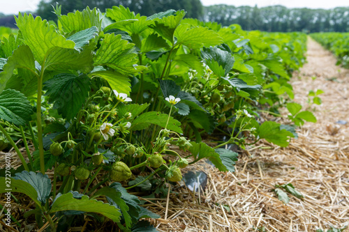 Fototapeta premium Strawberry fields, strawberry plants in rows growing on farm on open air