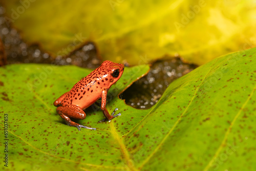 Naklejka premium Strawberry poison-dart frog (Oophaga pumilio, formerly Dendrobates pumilio), species of small poison dart frog found in Central America. Tortuguero, Costa Rica wildlife