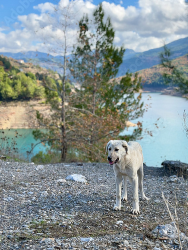 © Broker_Aleksandr, Fototapeta premium Stray dog ​​in nature with a view of the lake
