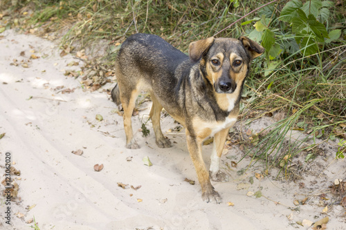 Naklejka premium Stray dog in the woods, hungry and tired.