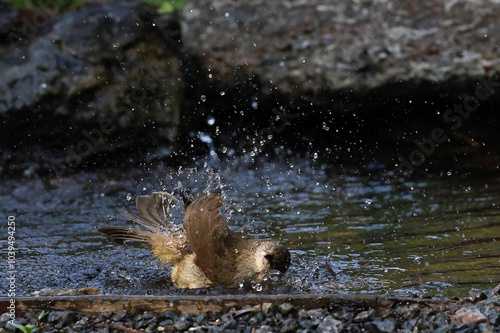 © Passakorn, Fototapeta premium Streak-eared Bulbul is playing happily in the pond.