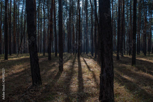 Obraz premium streaks of light and shadow on the ground in the forest
