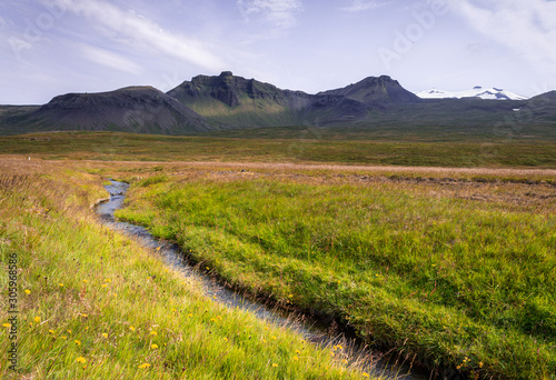© Marek Ševčík, Fototapeta premium Stream flowing on meadow field, high mountains in background