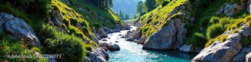 Fototapeta premium Stream flowing through a narrow mountain gorge with steep cliffs, nature,...