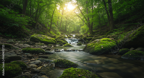 © Feri, Obraz premium Stream flowing through mossy rocks in forest