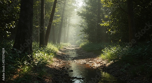 © ANISUL, Obraz premium Stream flows through a forest with sunlight filtering through the trees.