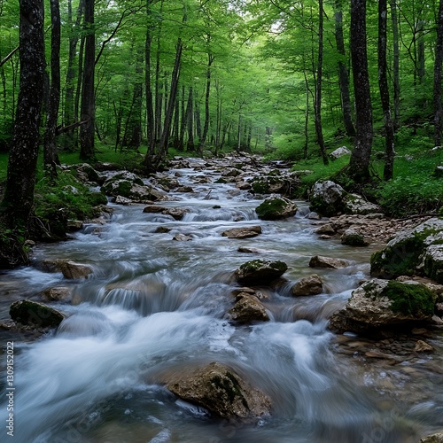 Obraz premium Stream Flows Through Lush Green Forest Scene
