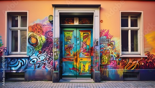 Naklejka premium street art in berlin door and house entrance painted with graffiti