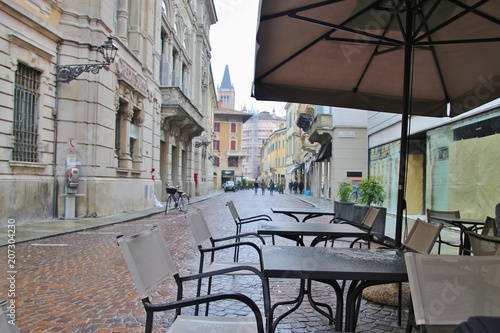© utamaria, Naklejka premium Street cafe with chairs and tables in rainy weather. In the background the Parma Cathedral and Baptistery. Italy, South Europe.