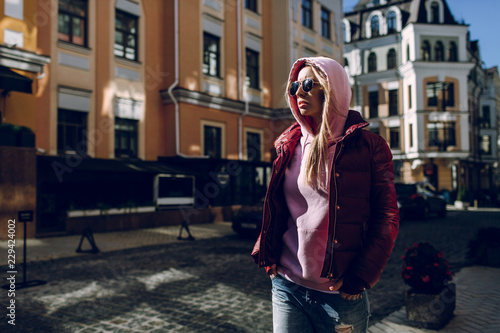 Fototapeta premium Street fashion concept - portrait of a beautiful girl sitting outside, blue jeans, sunglasses, hard lights, red jacket, autumn weather