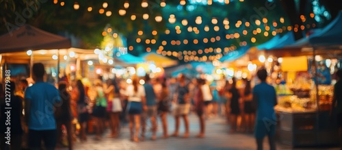 Naklejka premium Street festival atmosphere with food and drink booths colorful lights and blurred crowd creating a vibrant evening scene for text overlay