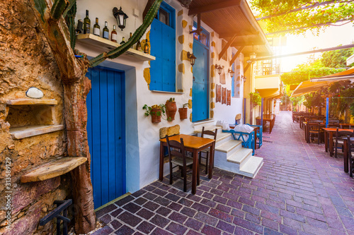 © daliu, Obraz premium Street in the old town of Chania, Crete, Greece. Charming streets of Greek islands, Crete. Beautiful street in Chania, Crete island, Greece. Summer landscape. Chania old street of Crete island Greece.