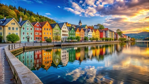 Fototapeta premium Street lined with colorful buildings overlooking a serene lake , urban, city, waterfront, architecture, vibrant, reflection