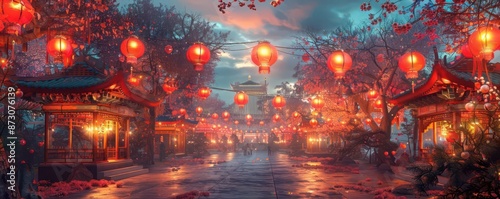 © Naphatson, Naklejka premium Street lined with lanterns at night, creating a warm and inviting atmosphere.