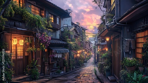 © Artelio, Fototapeta premium Street lit at dusk, old buildings, sky view